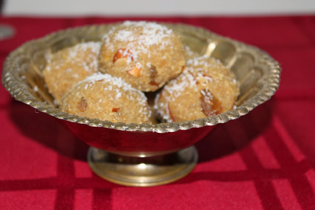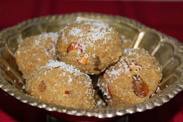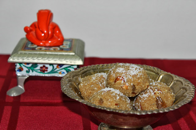 One more sweet dish / bhog dish. One of the family favorite. Ladoo / Ladu (in gujarati) made from a wheat flour semolina, Jaggery, nuts, and clarified butter (ghee). From my childhood I remember this dish made by my mom during Ganesh Utsav and many other occasions. This dish isnot only made in my family. But it's made by hundreds of families in Gujarat.